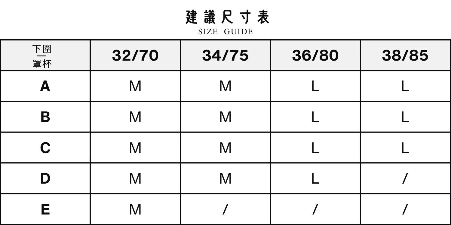 每款商品頁皆有詳細尺寸表,請依照「下胸圍、上胸圍」平常穿著習慣,進行比對。