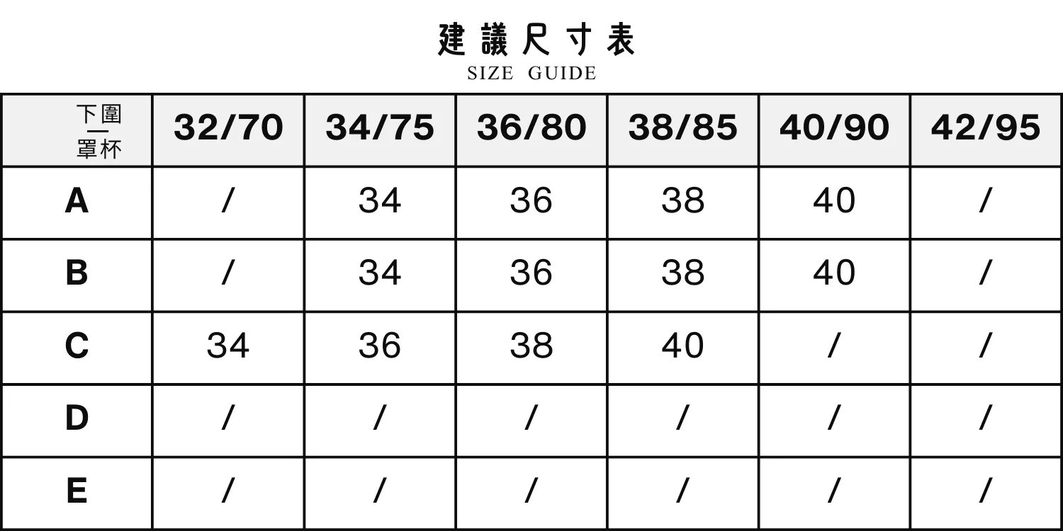 每款商品頁皆有詳細尺寸表,請依照「下胸圍、上胸圍」平常穿著習慣,進行比對。